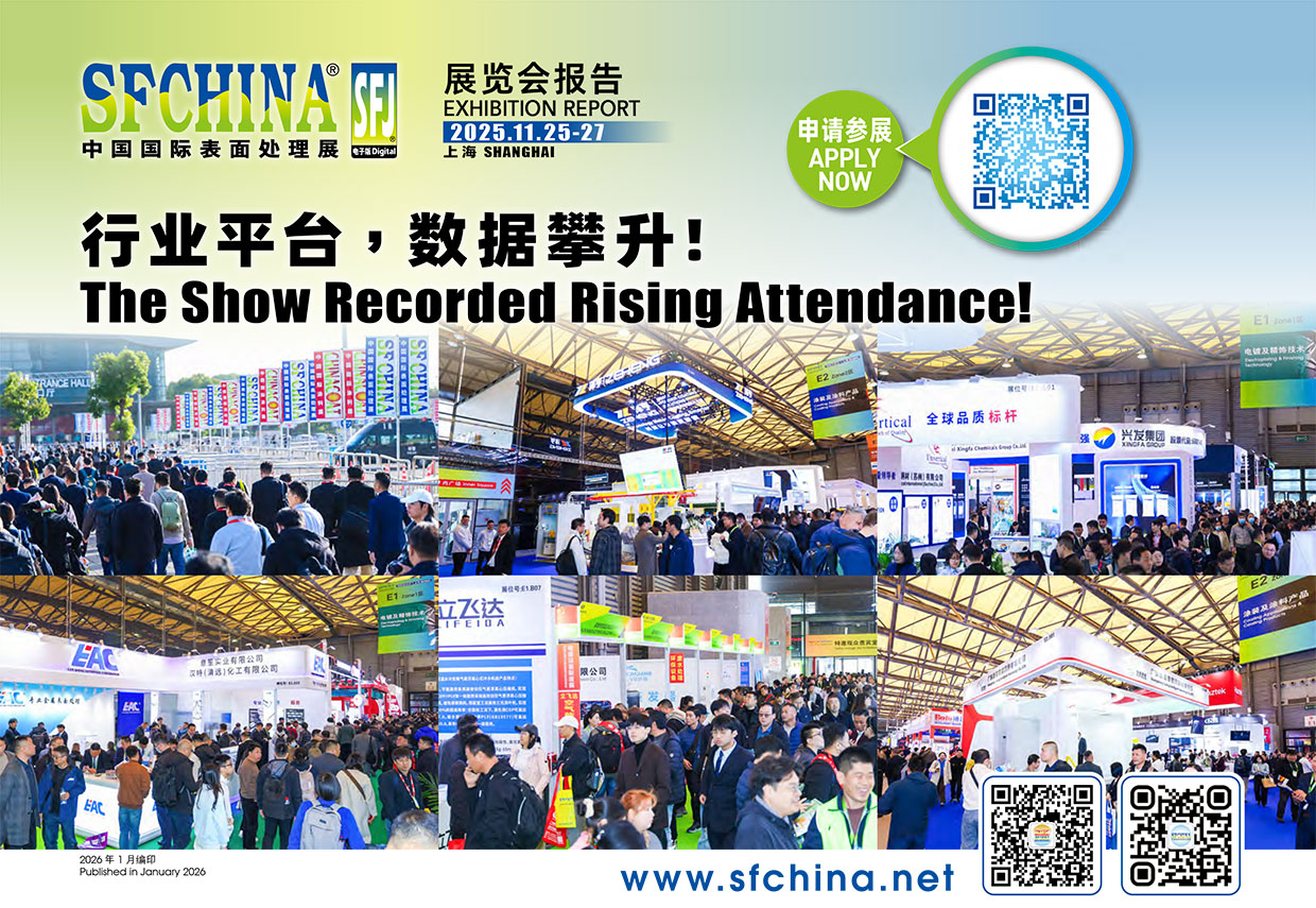 下一届「中国国际表面处理展 SFCHINA」将于 2026年11月11至13日 在 广州中国进出口商品交易会展馆 A 区 举行,继续为行业打造推动业务长期增长的平台。